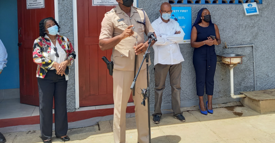 Then DSP and former Old Harbour Police Commander Damion Manderson addressing vendors in the Old Harbour Market on June 23, 2021 (OH News Photo)